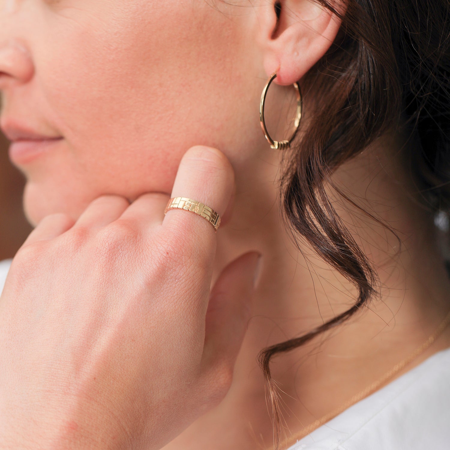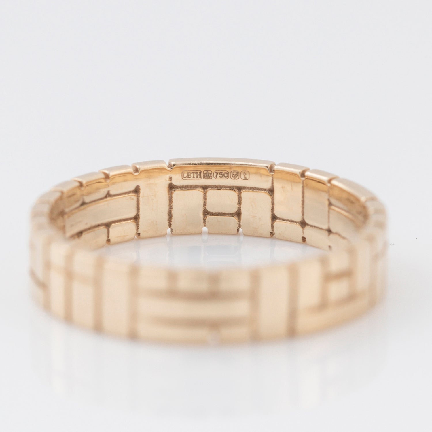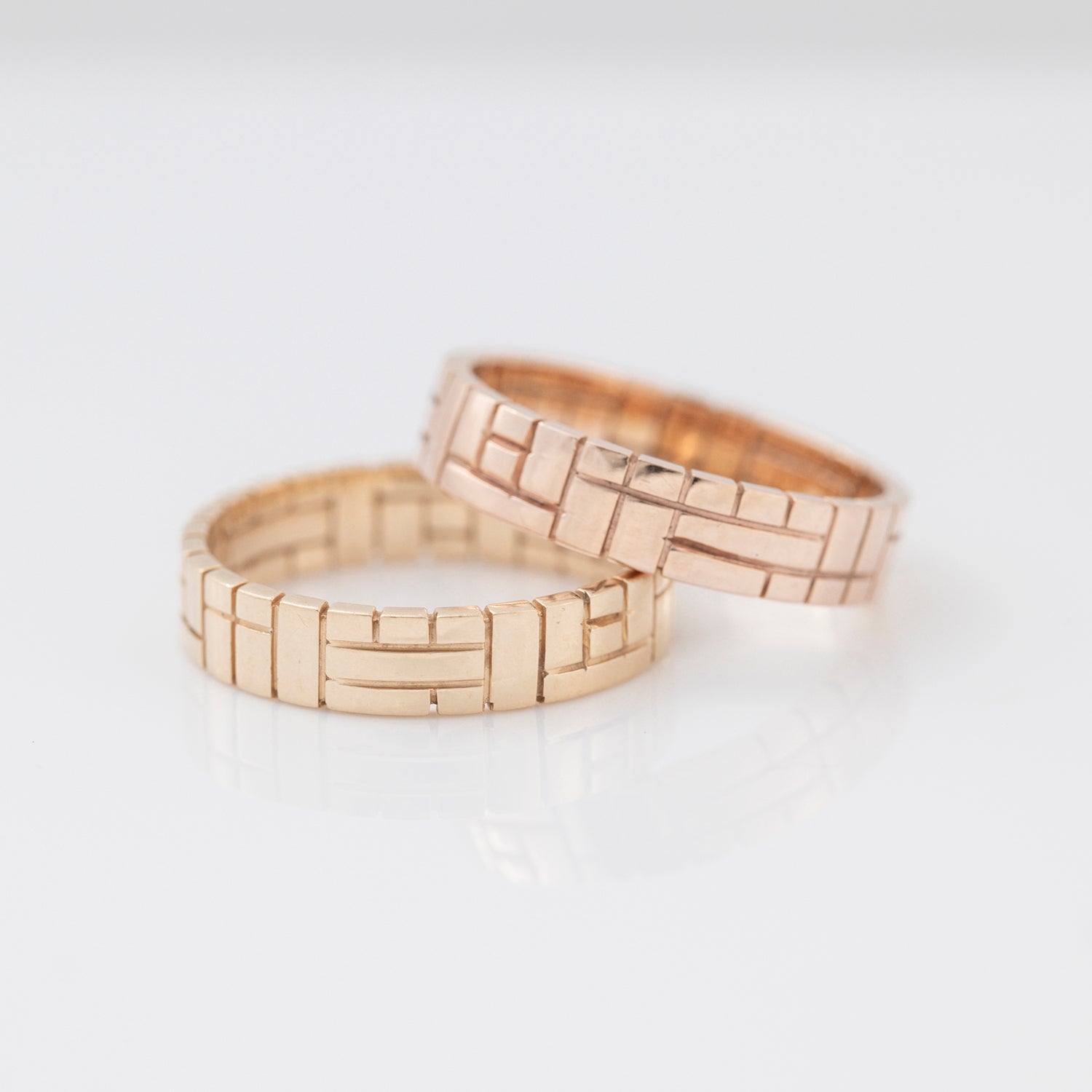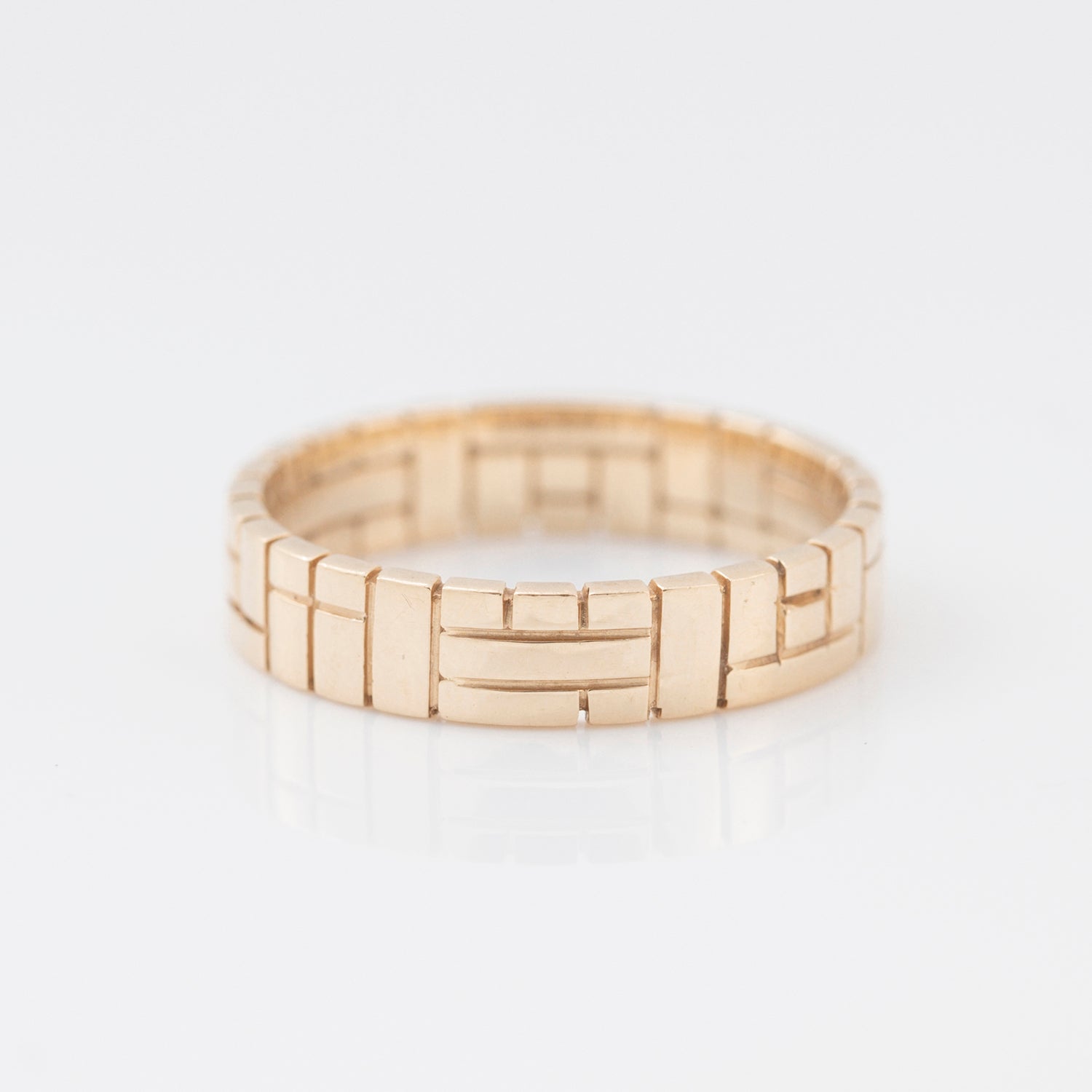 A solid yellow gold ring made up of pleasing small brick shaped cubes. The Philadelphia Slim is an understated yet bold piece that works on every finger. Half the size of the Philadelphia, this ring is extremely versatile and is perfect on its own or stacked for added impact.