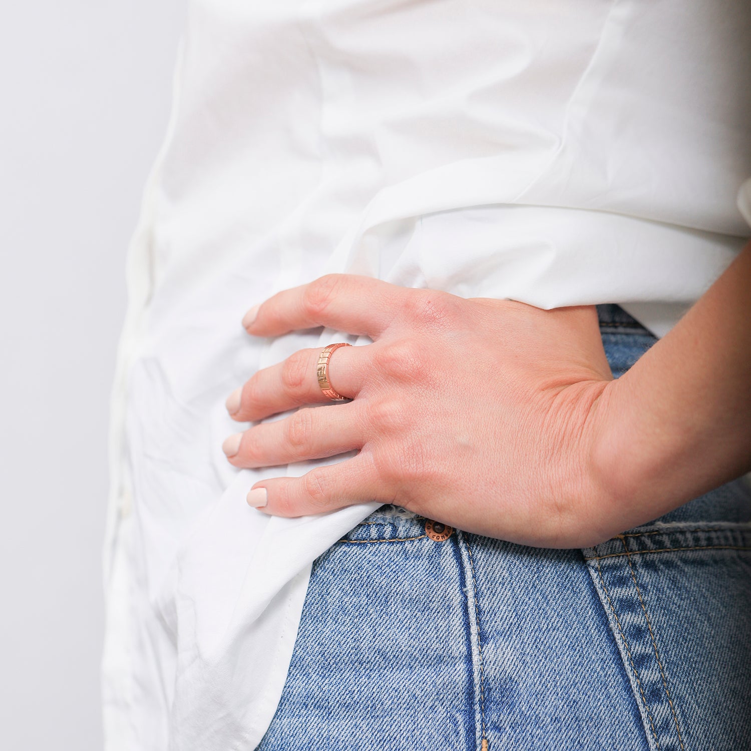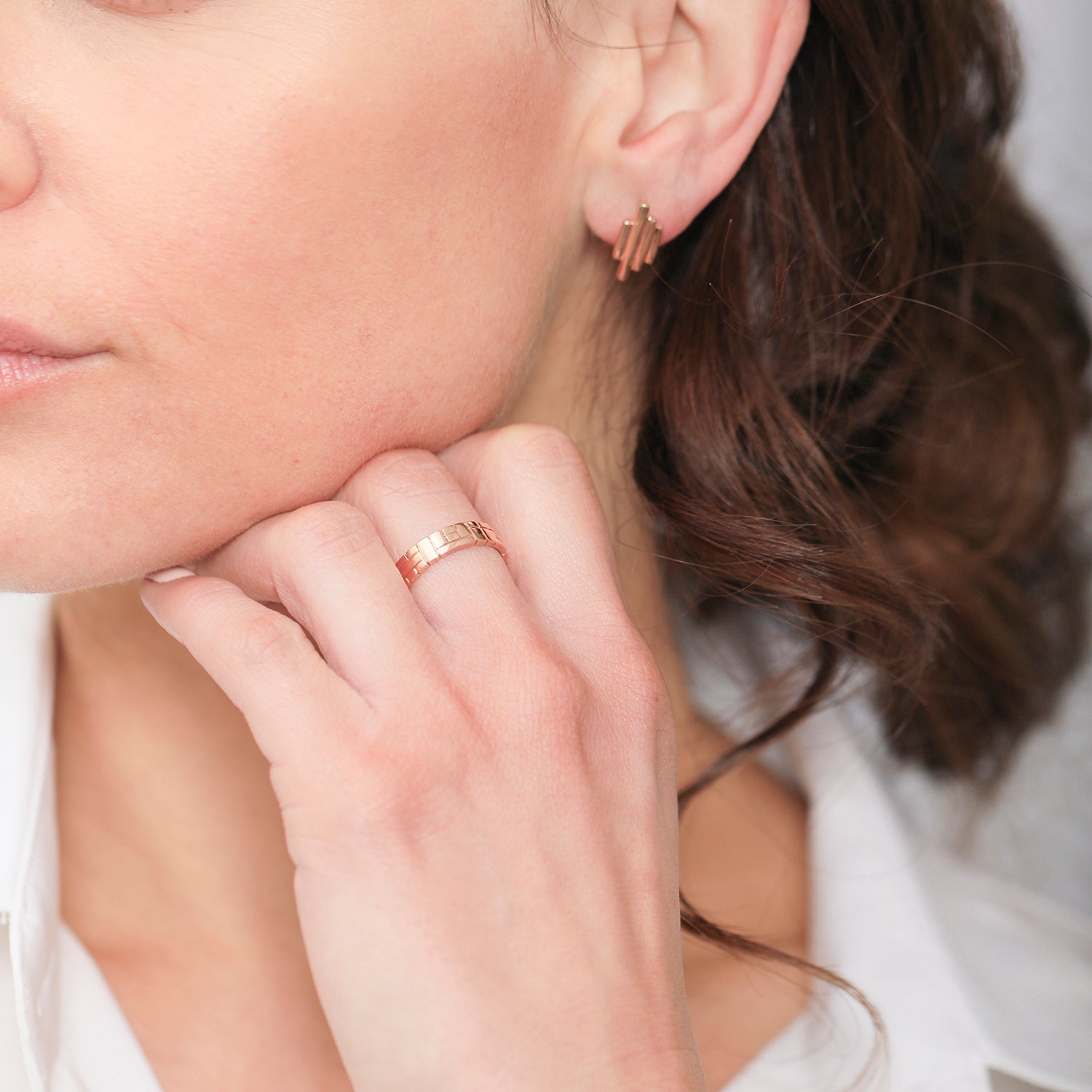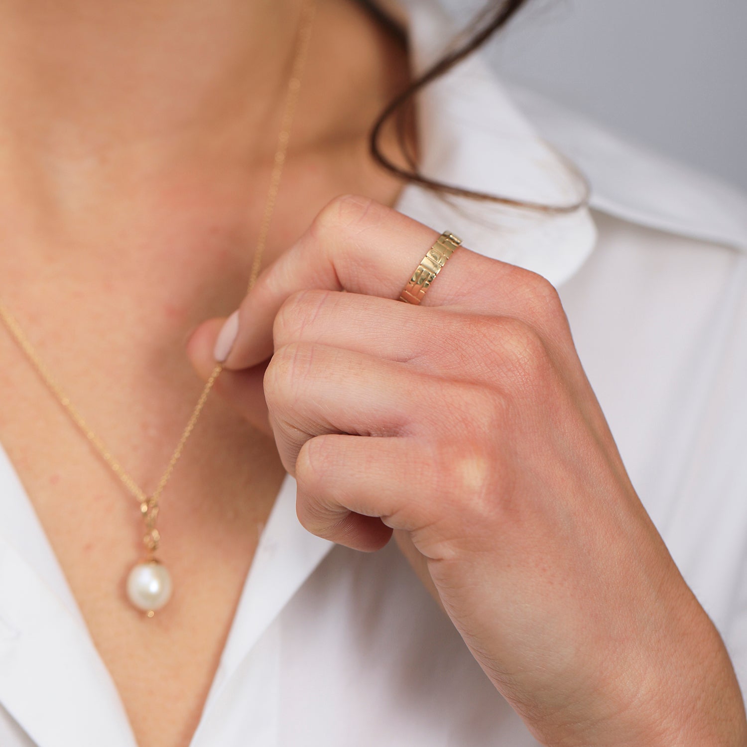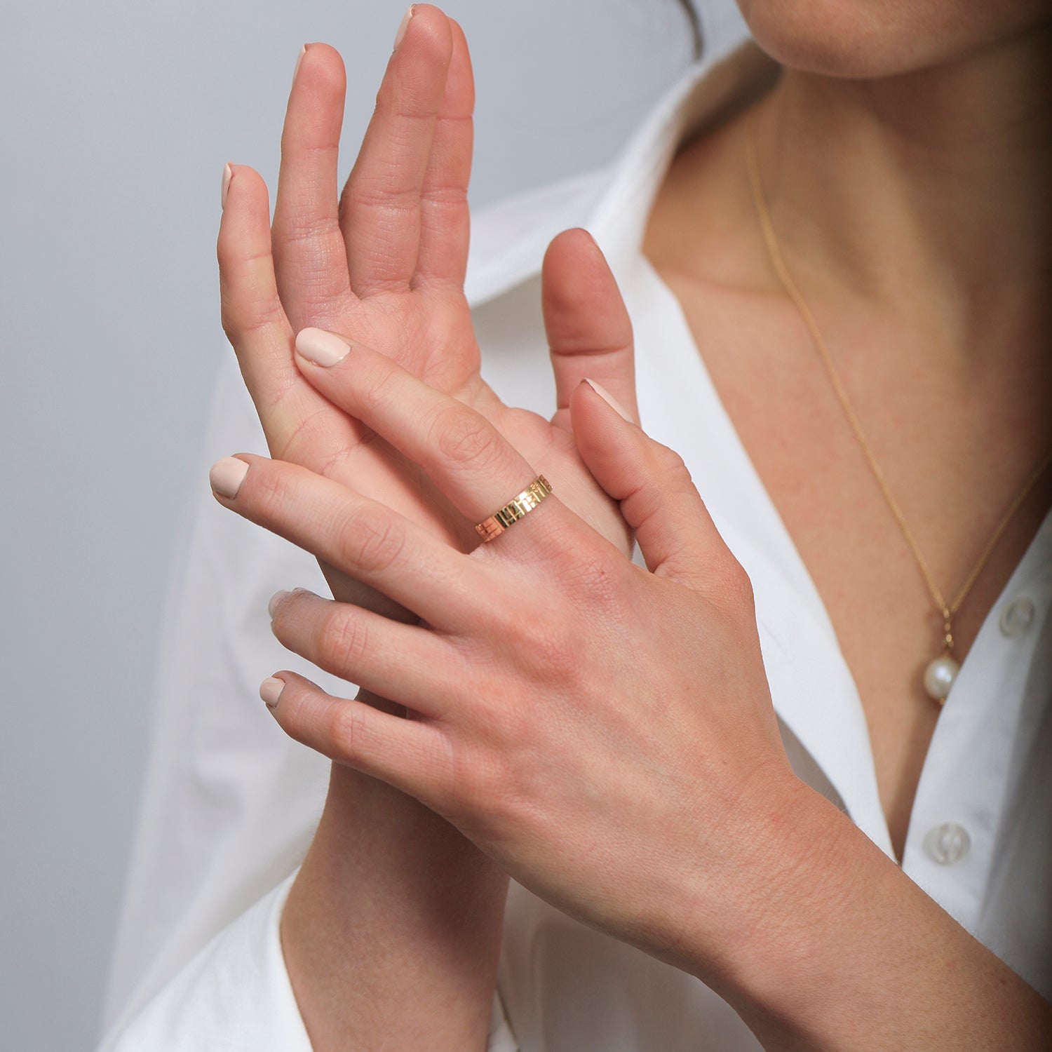 A solid yellow gold ring made up of pleasing small brick shaped cubes. The Philadelphia Slim is an understated yet bold piece that works on every finger. Half the size of the Philadelphia, this ring is extremely versatile and is perfect on its own or stacked for added impact.
